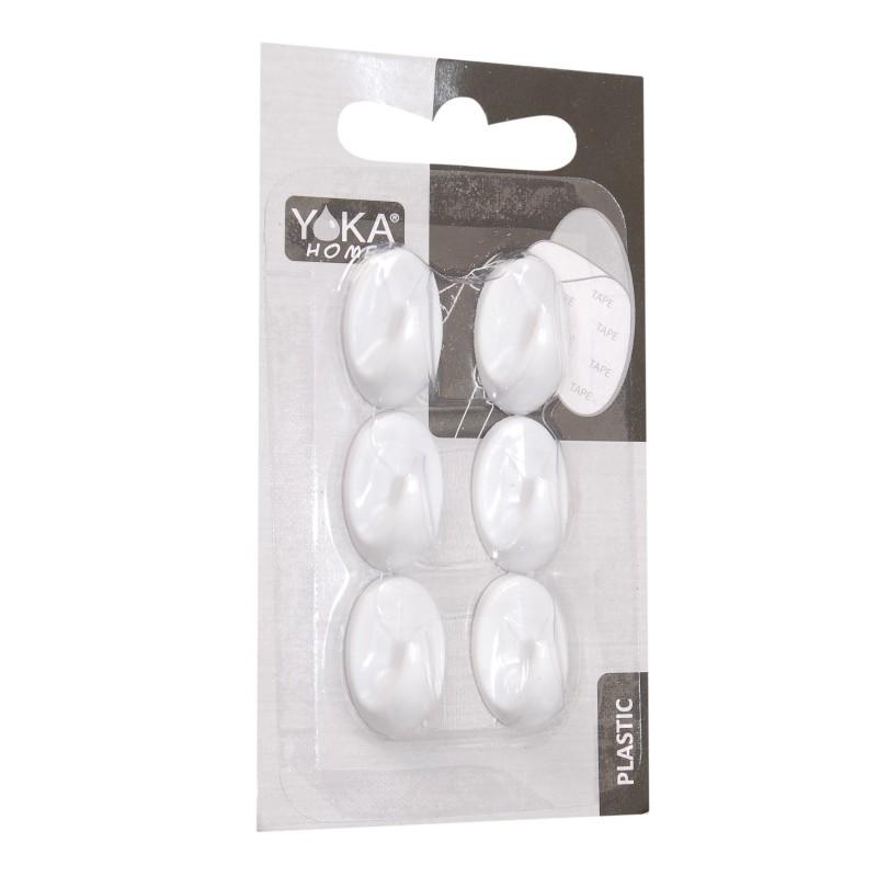 Zestaw białych, owalnych wieszaków samoprzylepnych. Komplet zawiera 6 sztuk. Haczyki samoprzylepne Yoka Home to alternatywa dla gwoździ i kołków rozporowych – przymocowanie ich do ściany trwa tylko chwilę. Nie niszczą glazury. Wykonane są z tworzywa sztucznego. Idealnie sprawdzą się w łazience, toalecie, biurze czy kuchni.