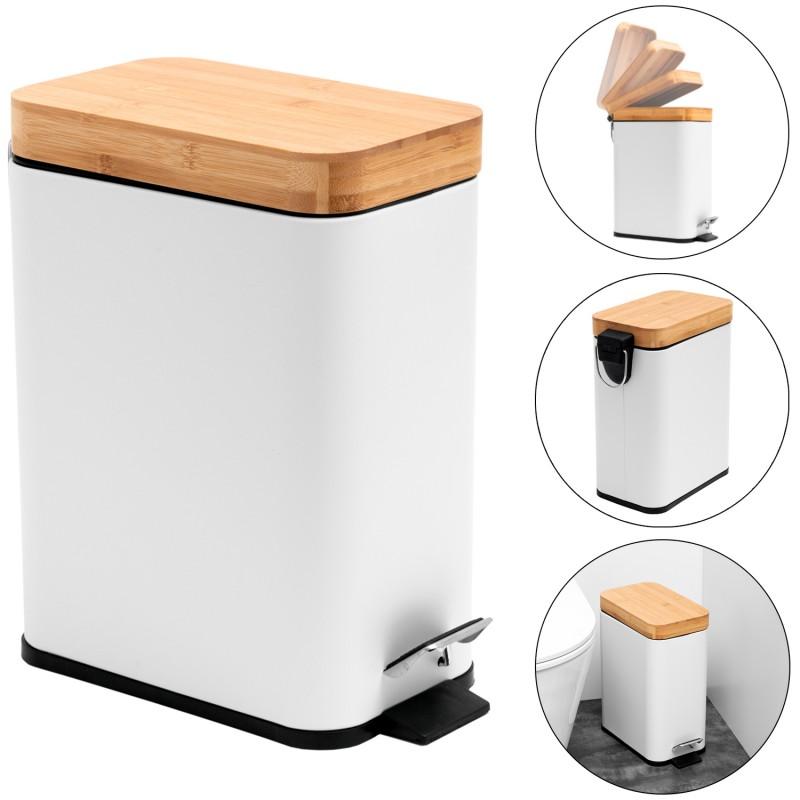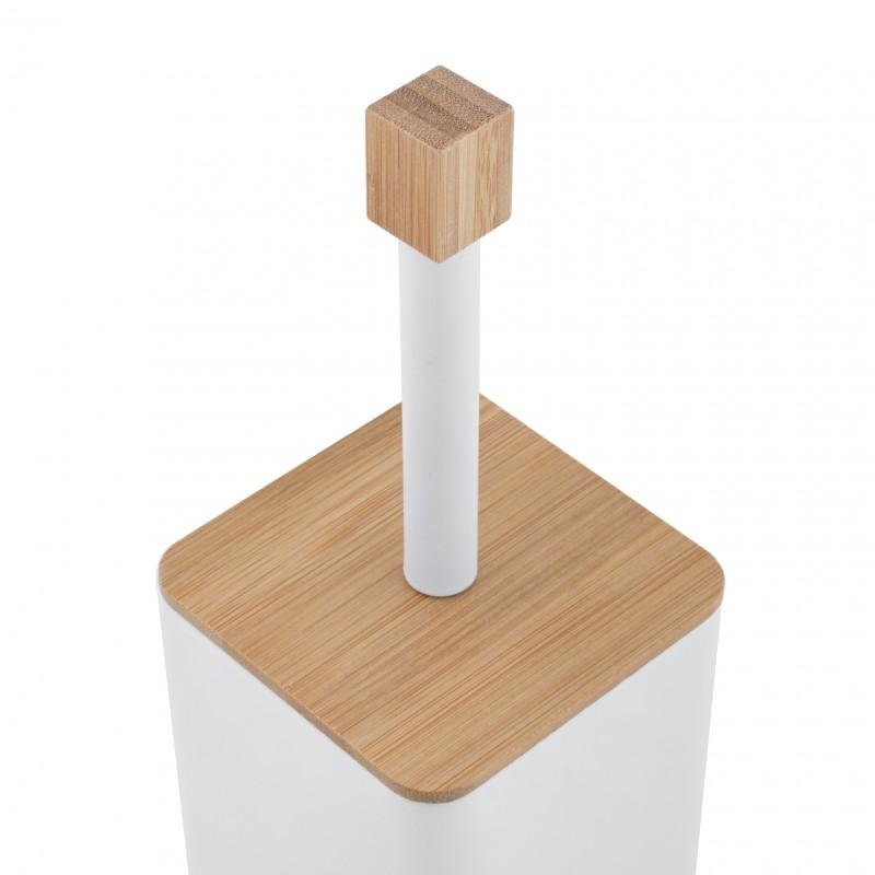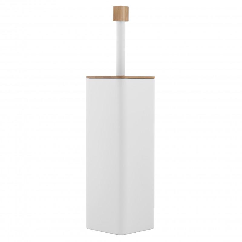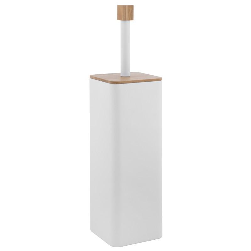 Szczotka do WC wykonana z wysokiej jakości stali malowanej na biało z elementami naturalnego drewna bambusowego. Wewnątrz pojemnika znajduje się wyjmowana plastikowa osłonka na ociekającą wodę, dzięki czemu pojemnik na szczotkę wewnątrz jest suchy i czysty. Szczotka doskonale pasuje do łazienki zarówno w stylu boho jak i w stylu nowoczesnym, bądź klasycznym.