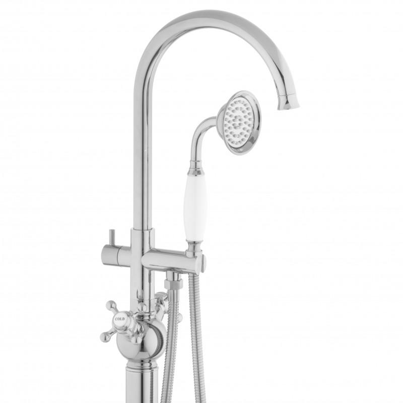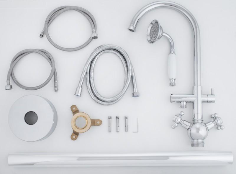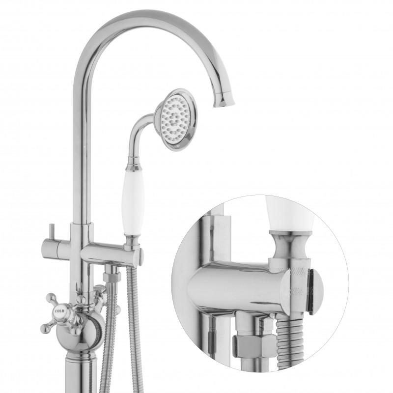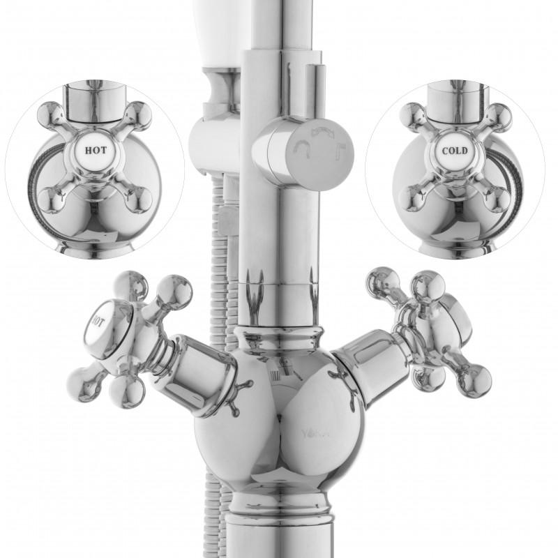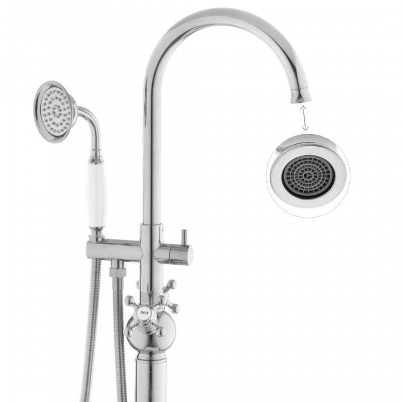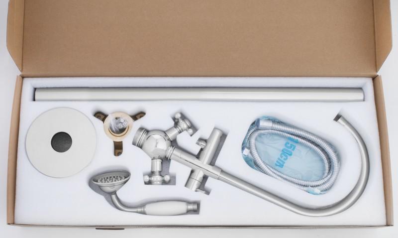 Bateria wannowa z kompletem natryskowym w stylu retro w kolorze srebrnym wzbogacona o białe wstawki.