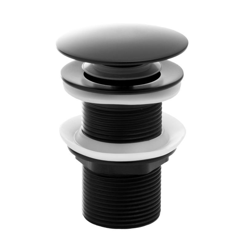 Okrągły korek klik-klak do umywalki bez przelewu. Wykonany z mosiądzu, malowanego proszkowo na kolor czarny. Korek pozwala na szczelne zamknięcie odpływu w umywalce zatrzymując odpowiednią ilość wody. Jest bardzo prosty w obsłudze – steruje nim mechanizm przyciśnięcia tzw. klik-klak – wystarczy jedno naciśnięcie, aby zamknąć lub otworzyć odpływ wody.
