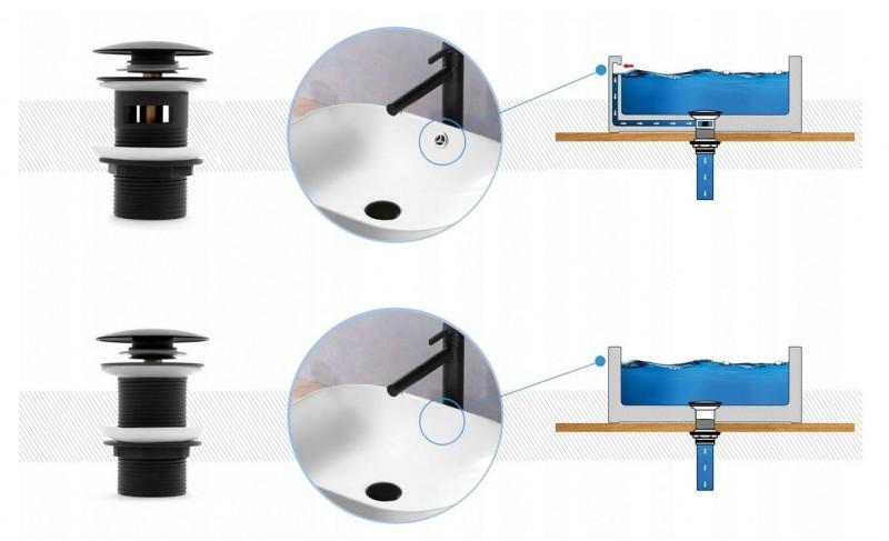 Jest to niewielkich rozmiarów otwór zlokalizowany w górnej części pod samym kranem. Zapobiega on przelaniu się wody w momencie, w którym chcemy napełnić umywalkę. To, czy zostanie zakupiony korek bez przelewu czy z przelewem uzależnione jest więc od tego, jakim konkretnie modelem zbiornika dysponujemy.