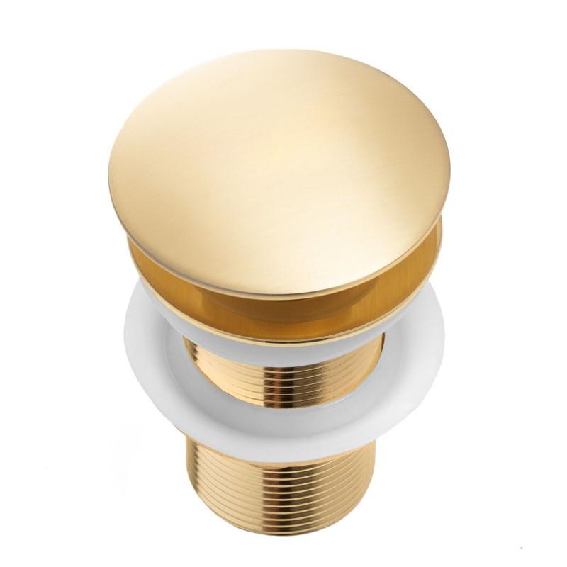 Okrągły korek klik-klak do umywalki bez przelewu. Wykonany z mosiądzu, malowanego na kolor złoty. Korek pozwala na szczelne zamknięcie odpływu w umywalce zatrzymując odpowiednią ilość wody. Jest bardzo prosty w obsłudze – steruje nim mechanizm przyciśnięcia tzw. klik-klak – wystarczy jedno naciśnięcie, aby zamknąć lub otworzyć odpływ wody.