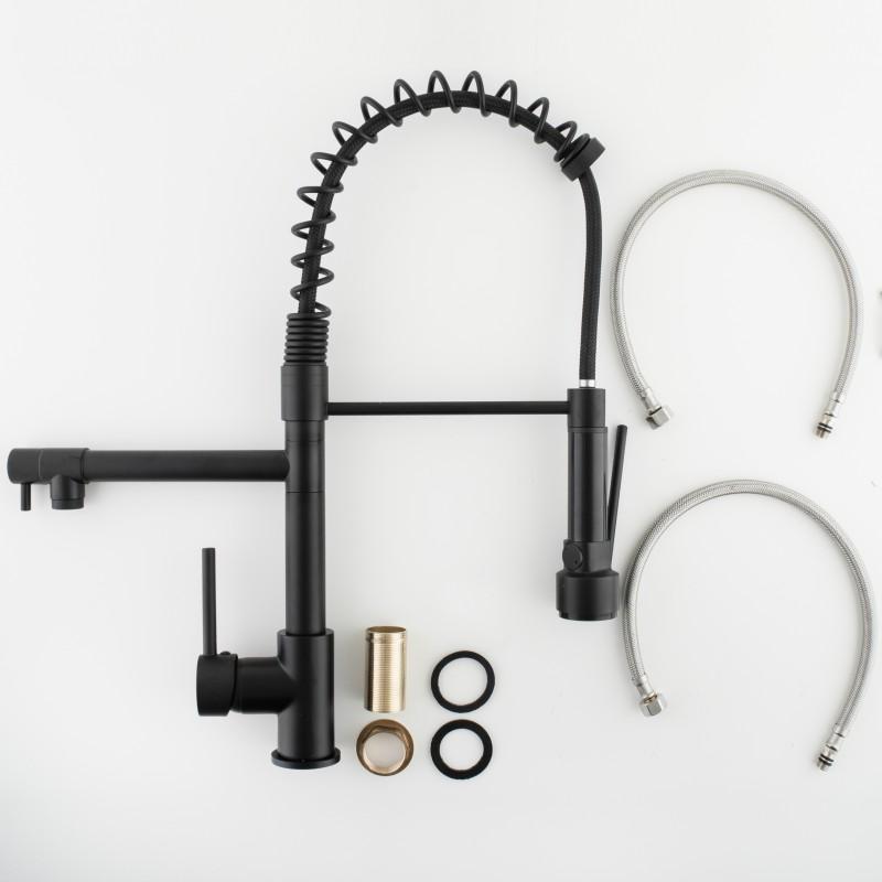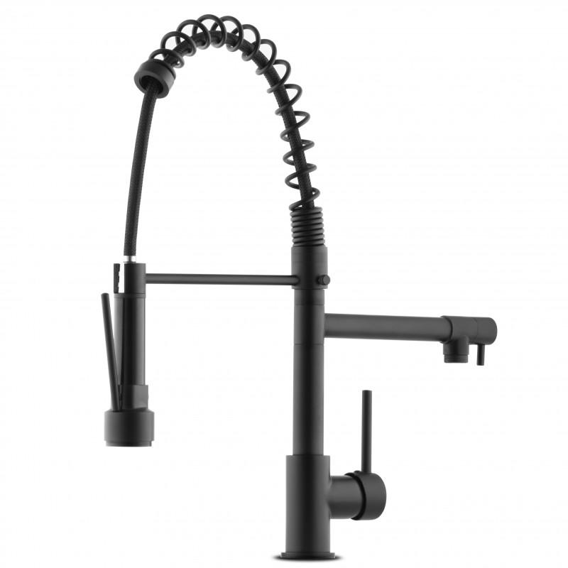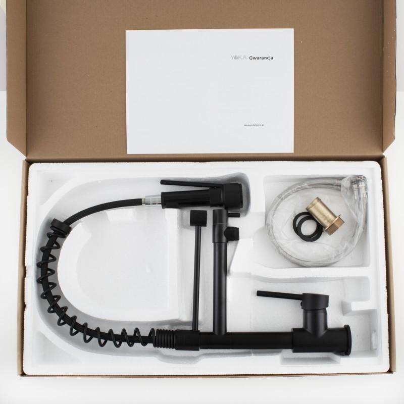 Bateria posiada dwie obrotowe wylewki (sztywną oraz elastyczną). Elastyczna wylewka posiada długi wąż,