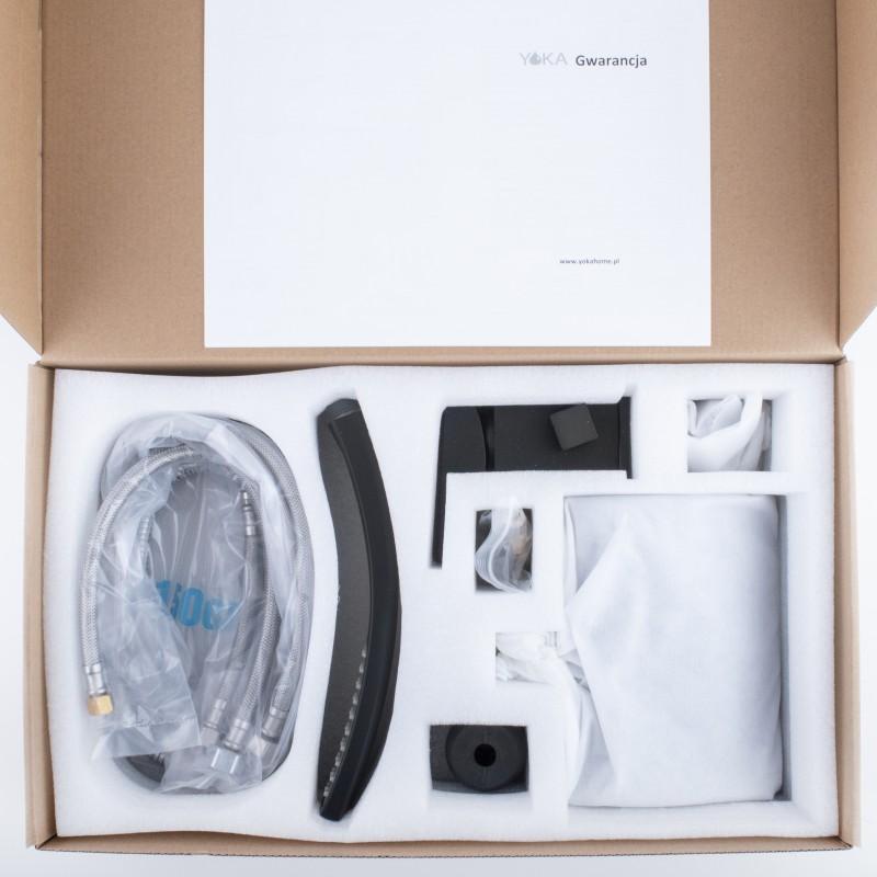 Nowoczesny zestaw z baterią wannową oraz słuchawką prysznicową. Zawiera baterię z mechanicznym przełącznikiem strumienia wody wylewka / słuchawka, sztywną wylewkę z efektem wodospadu oraz zestaw natryskowy ze słuchawką prysznicową. Zestaw zawiera 2 wysokiej jakości wężyki w oplocie ze stali nierdzewnej o długości 50 cm ze standardowym przyłączem 3/8 cala oraz jeden z przyłączem 1/2 cala. Design zestawu został podporządkowany najnowszym trendom - prezentuje się niezwykle elegancko i idealnie pasuje do nowocześnie urządzonej łazienki.
