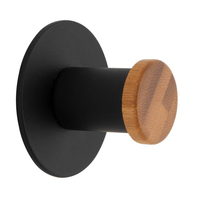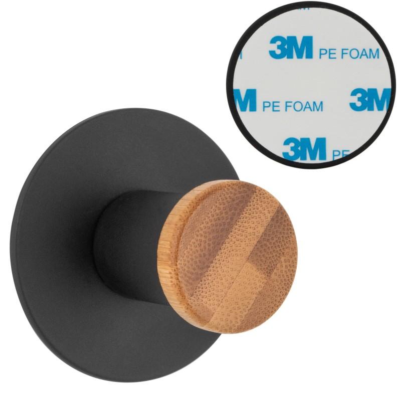 Komplet dwóch wieszaków łazienkowych na ręczniki, mocowany do ściany na taśmę 3M. Posiada jeden uchwyt. Wykonany z wysokiej jakości stali malowanej proszkowo na kolor czarny. Końcówka uchwytu posiada element dekoracyjny z naturalnego drewna bambusowego.