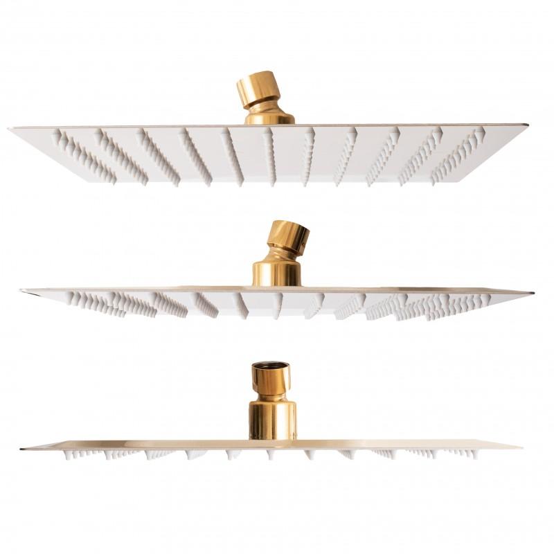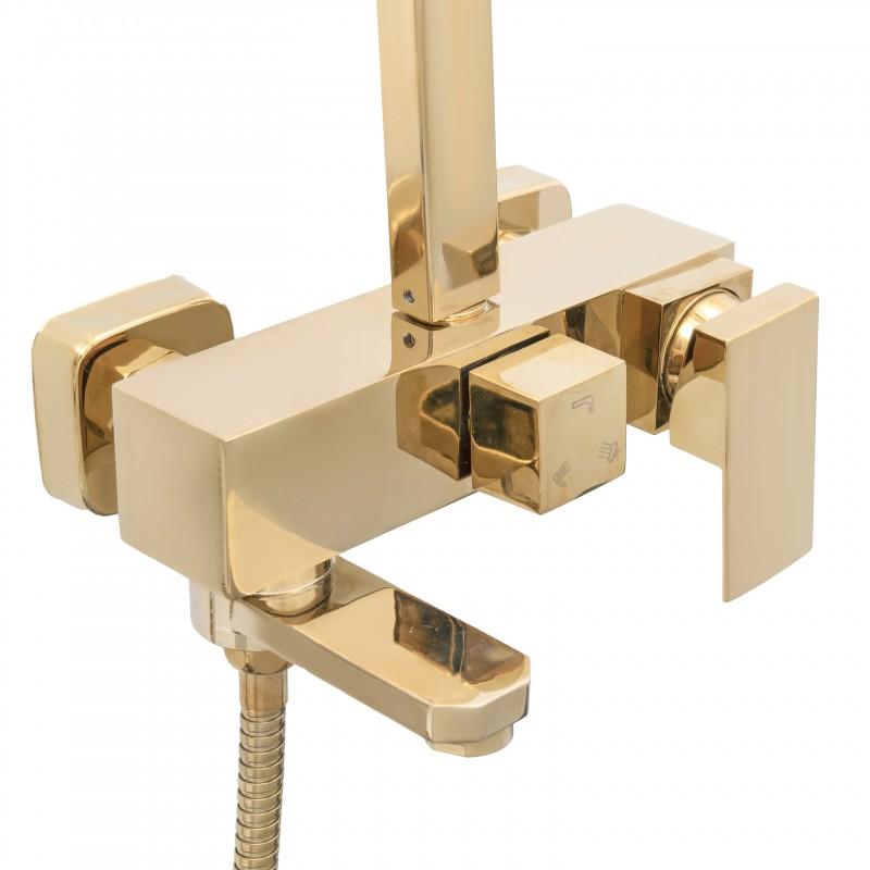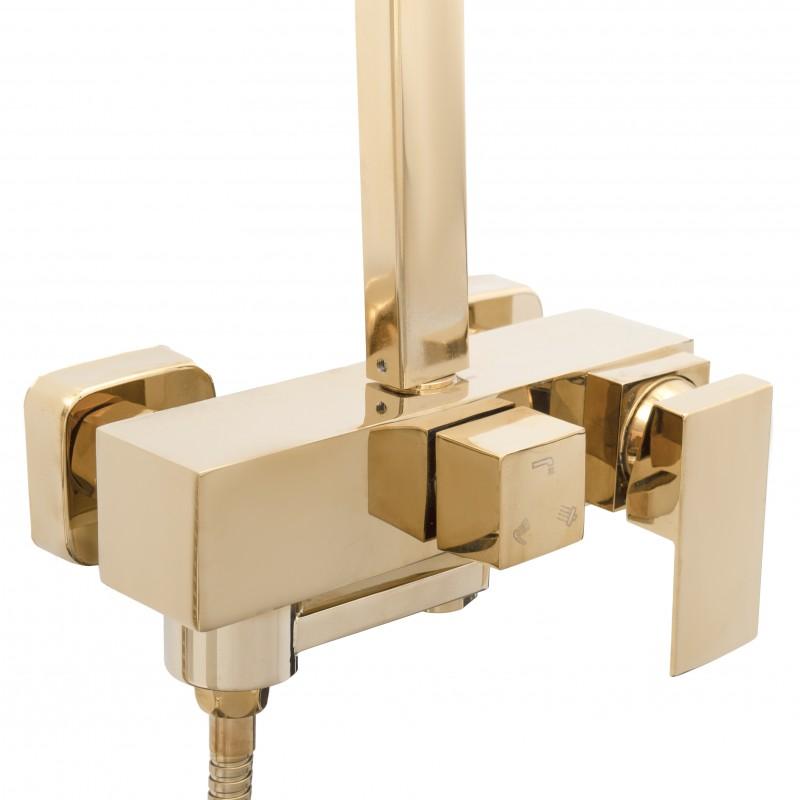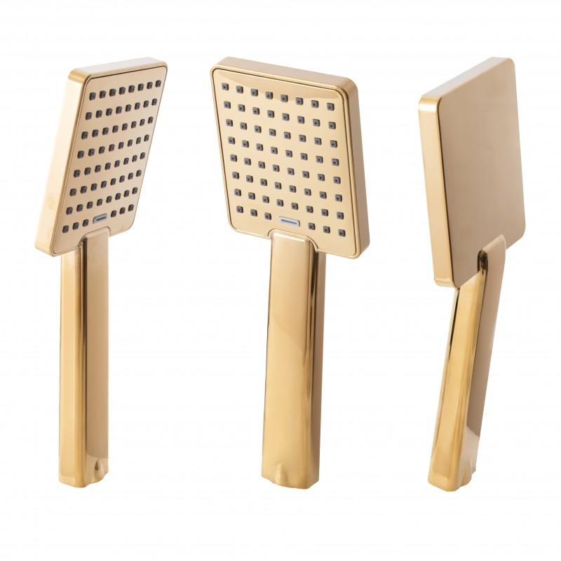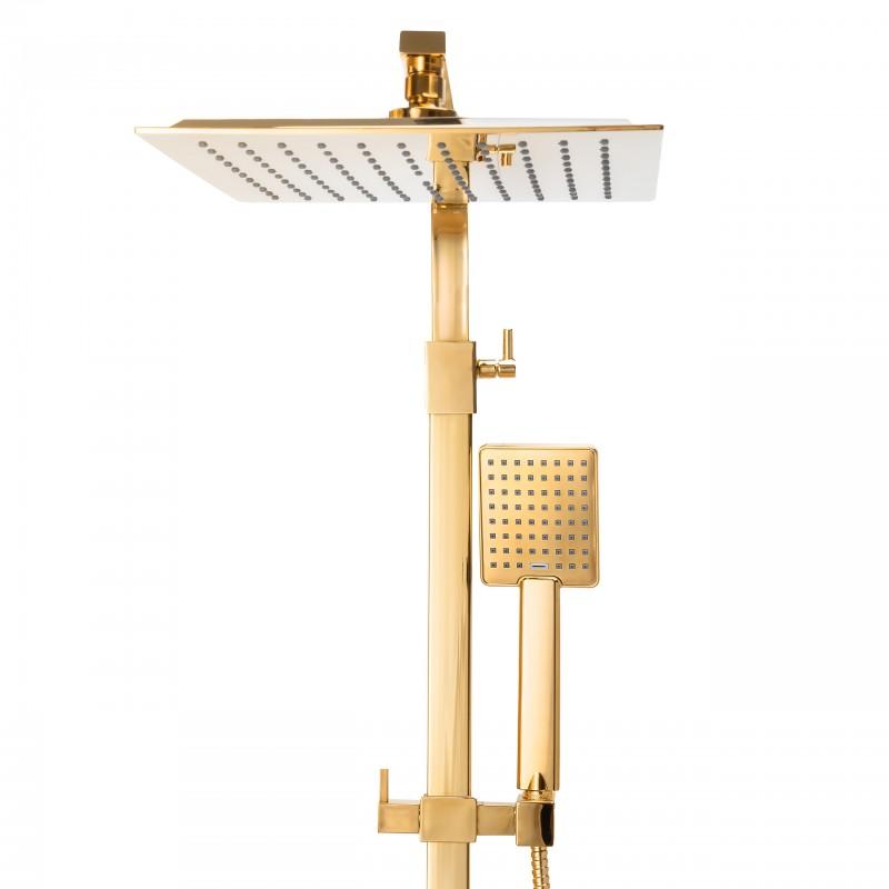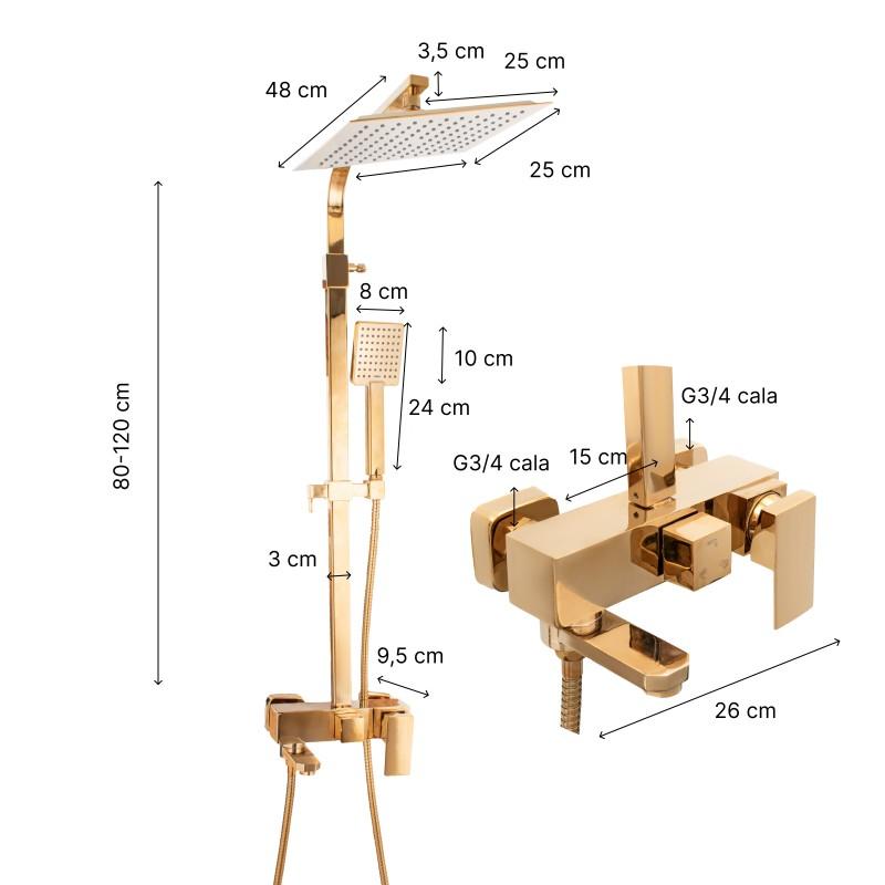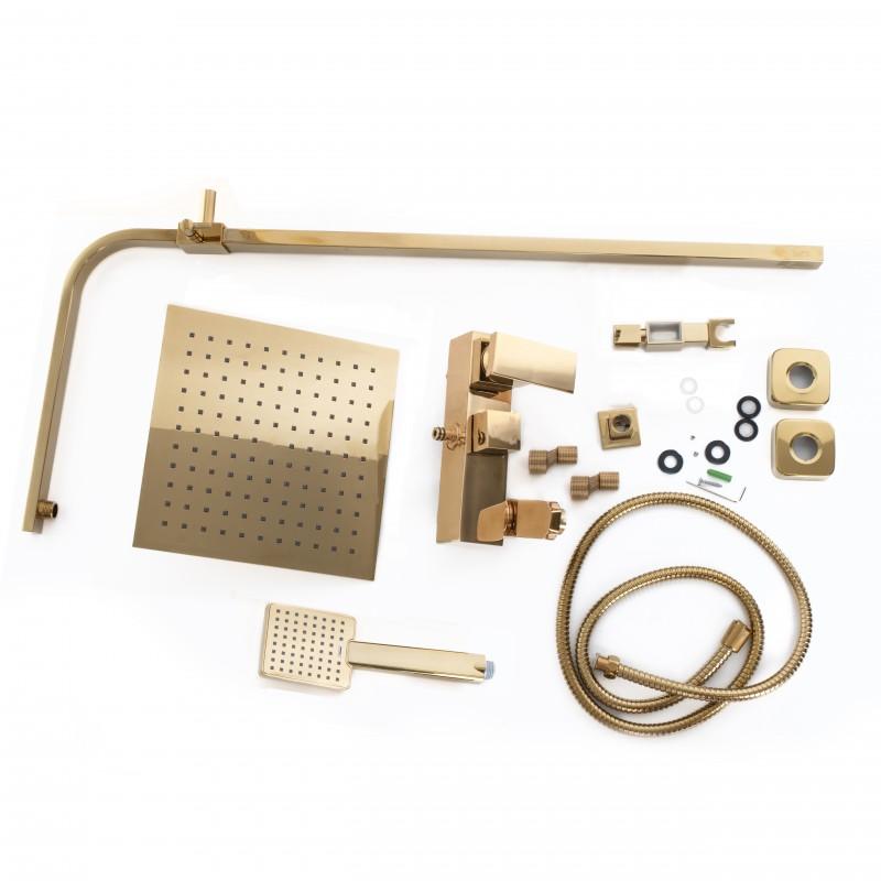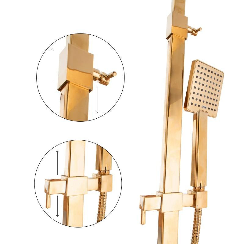 W zestawie bateria prysznicowa z mieszaczem temperatury, regulacją i przełącznikiem strumienia wody między deszczownicą, a słuchawką. Ceramiczna głowica baterii (35 mm) gwarantuje trwałość i wytrzymałość. Zestaw zawiera szeroką, stylową deszczownicę o wymiarach 25 x 25 cm oraz słuchawkę prysznicową w złotym kolorze - obydwa elementy z nowoczesnym systemem ANTI-CALC. Design zestawu został podporządkowany najnowszym trendom - prezentuje się niezwykle elegancko i idealnie pasuje do nowocześnie urządzonej łazienki.