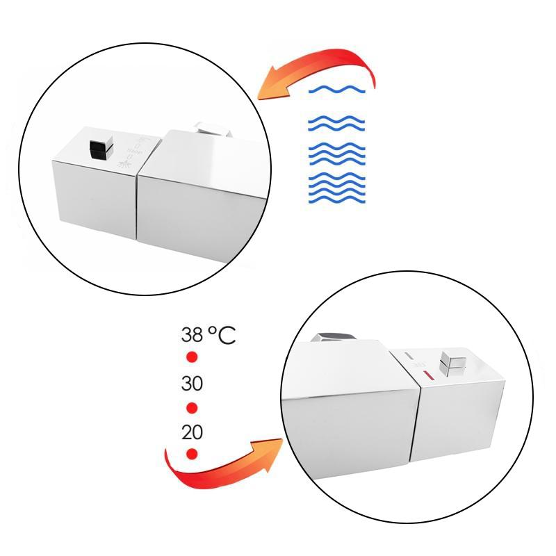 Termostatyczna naścienna bateria prysznicowa z opcją blokady gorącej wody przy 38°C. Wykonana jest z wysokiej jakości mosiądzu pokrytego chromem. Jej ceramiczna głowica (35 mm) gwarantuje trwałość i wytrzymałość. W zestawie znajdują się wszystkie elementy potrzebne do montażu.
