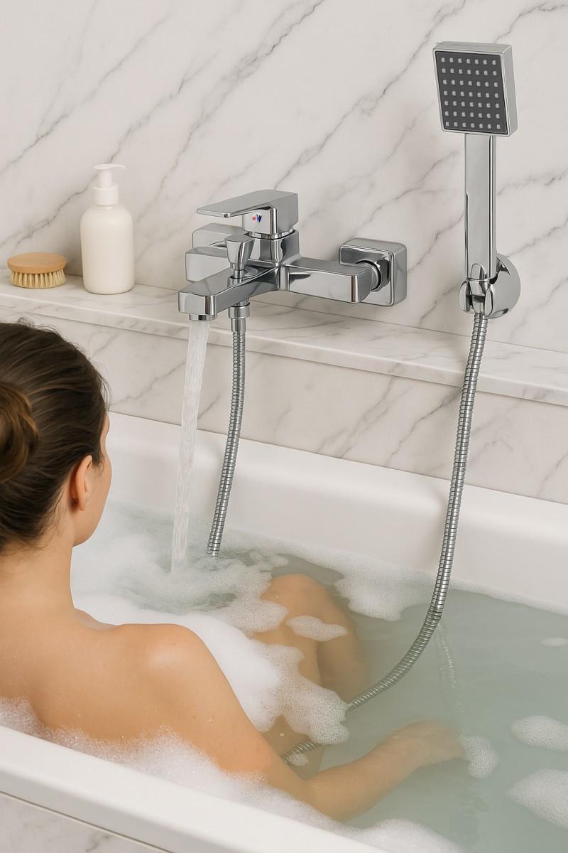 Rodzaj baterii: Wannowo-prysznicowy, ścienny, jednouchwytowy, dwuotworowy, z przełącznikiem i słuchawką prysznicową