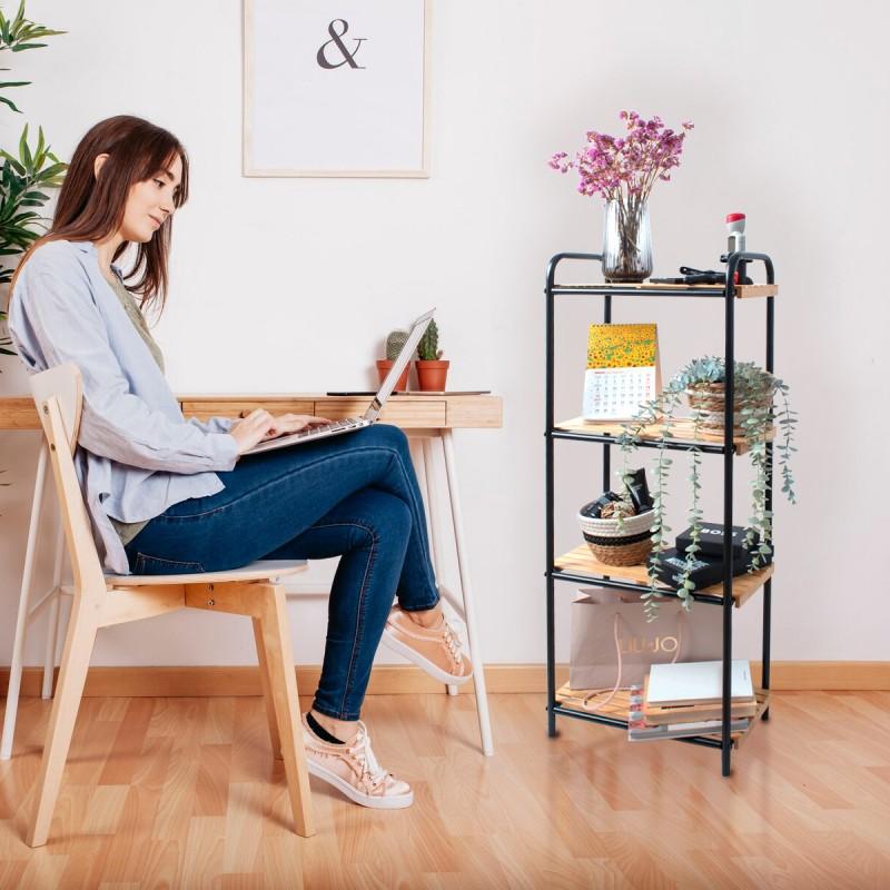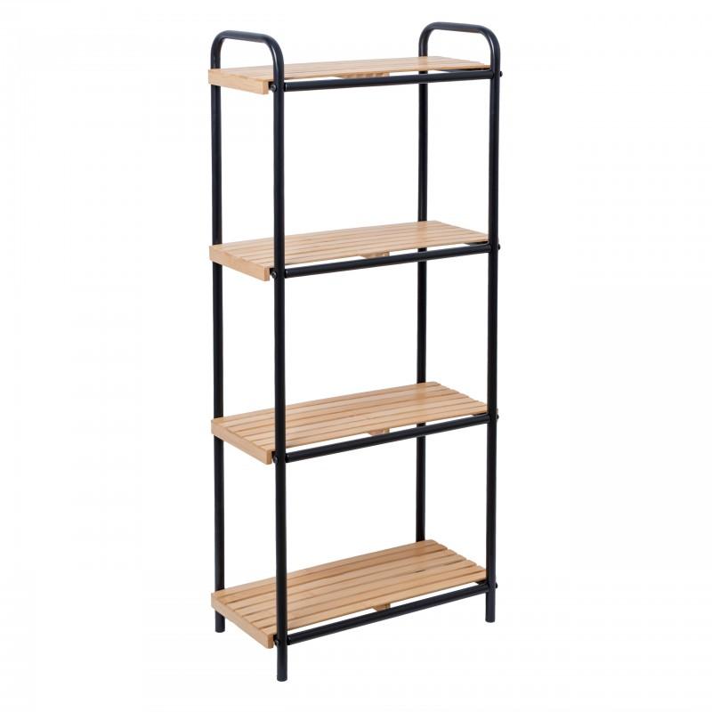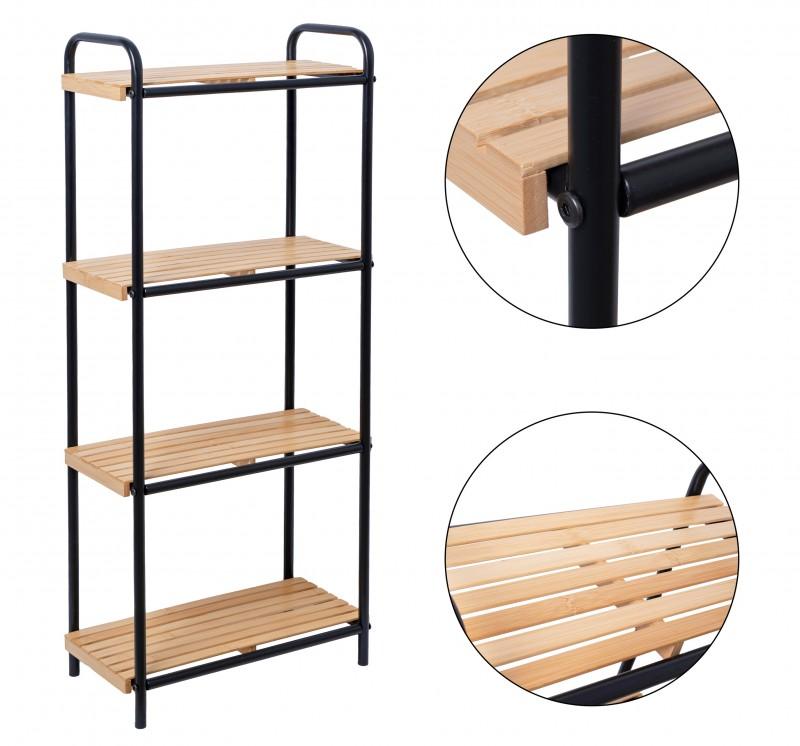 Regał wykonany z naturalnego drewna bambusowego. Jest niezwykle prosty a jednocześnie bardzo elegancki. Połączenie naturalnych materiałów z czarną ramą nadaje niepowtarzalnego charakteru regałowi. Regał wyposażony został w 4 pojemne półki, które pomieszczą wszystkie niezbędne akcesoria i przybory w łazience.