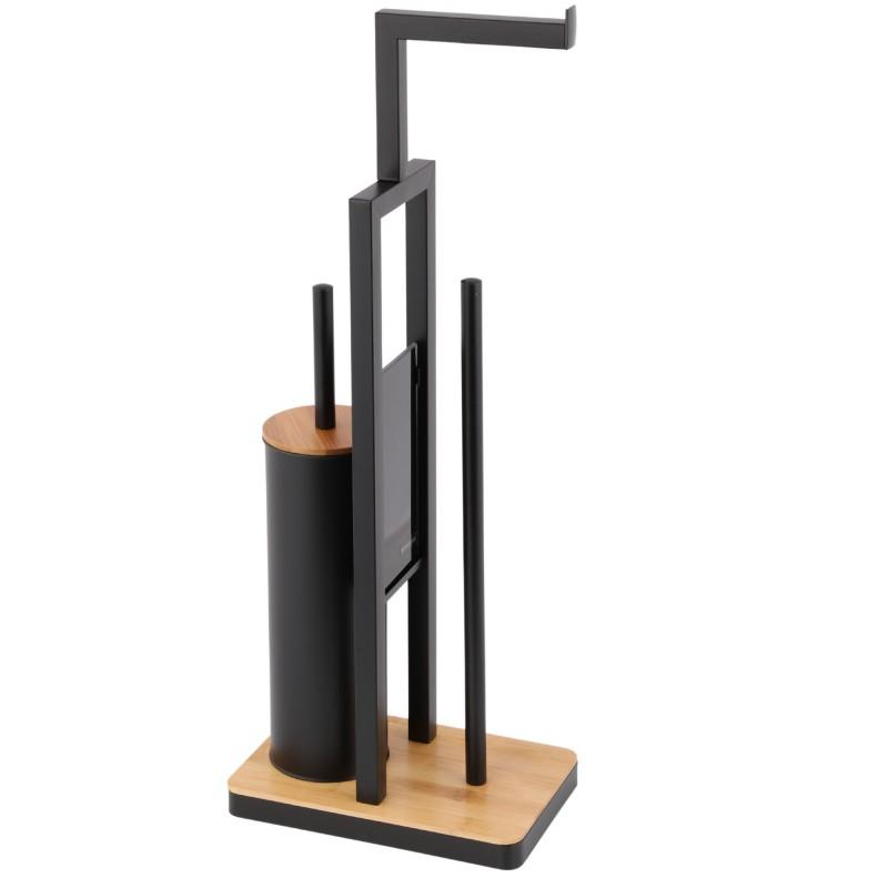 Elegancki stojak na zapasowy papier toaletowy wraz ze szczotką WC oraz z uchwytem na dodatkowe 4 rolki.