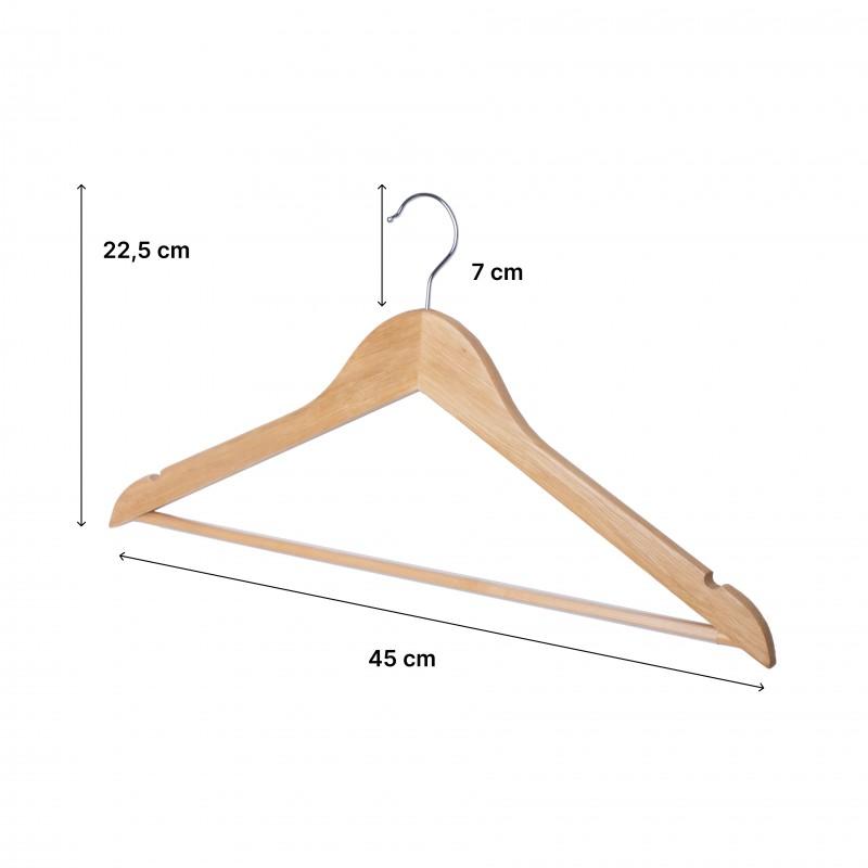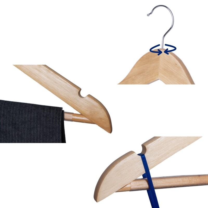 Wysokiej jakości wieszaki wykonane z naturalnego drewna, polakierowane lakierem. Uniwersalne, naturalne kolory wieszaków doskonale wkomponują się w kolorystykę każdej garderoby. Wieszaki wykonane są z litego drewna z chromowanymi haczykami.