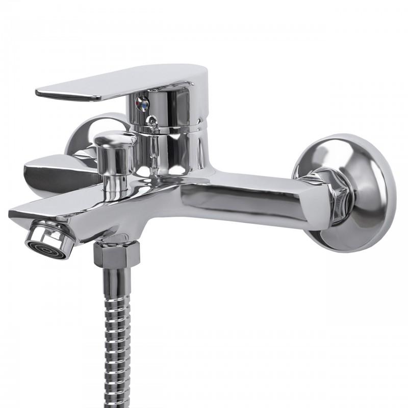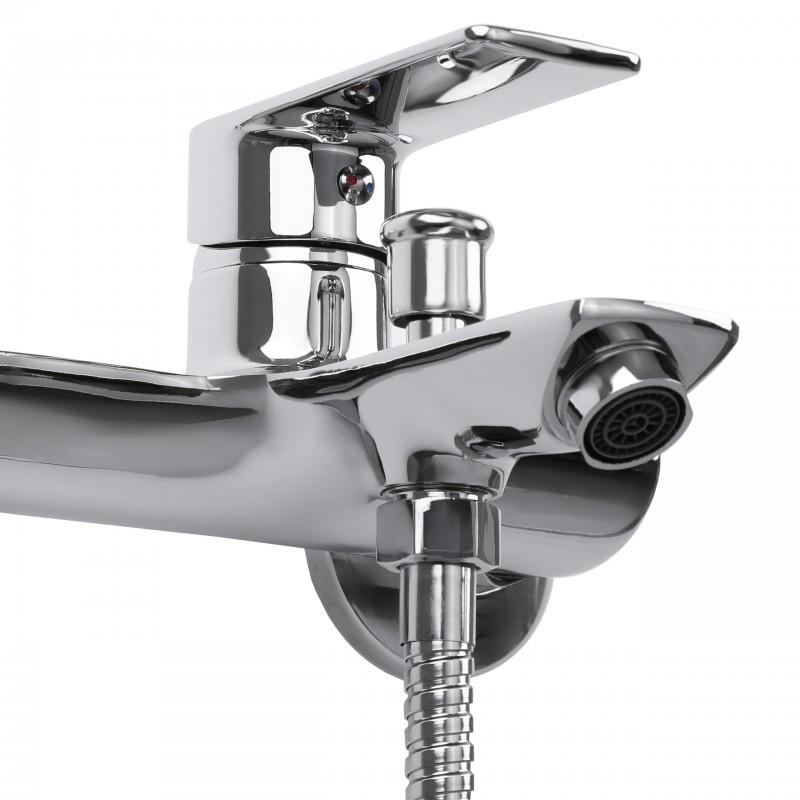 Mechaniczna bateria wannowo-prysznicowa, ścienna, jednouchwytowa ze stałą wylewką.