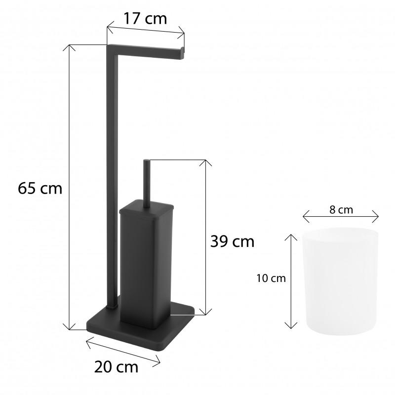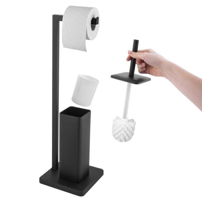 Praktyczny i stylowy stojak, wykonany z wysokiej jakości stali malowanej proszkowo na matową czerń. Zintegrowany uchwyt na papier toaletowy oraz umieszczona obok szczotka WC to oszczędność miejsca i eleganckie rozwiązanie dla każdej łazienki. Stabilna, kwadratowa podstawa z antypoślizgowymi podkładkami zapewnia bezpieczeństwo i stabilność. Szczotka WC posiada czarną pokrywę i górną część, białe włosie oraz wewnętrzny pojemnik na ociekającą wodę, co ułatwia utrzymanie higieny.