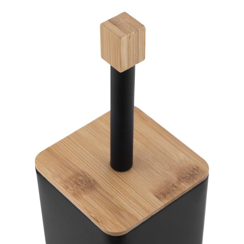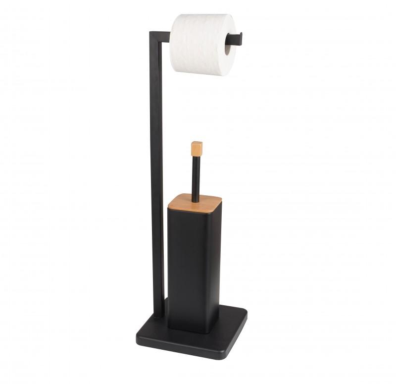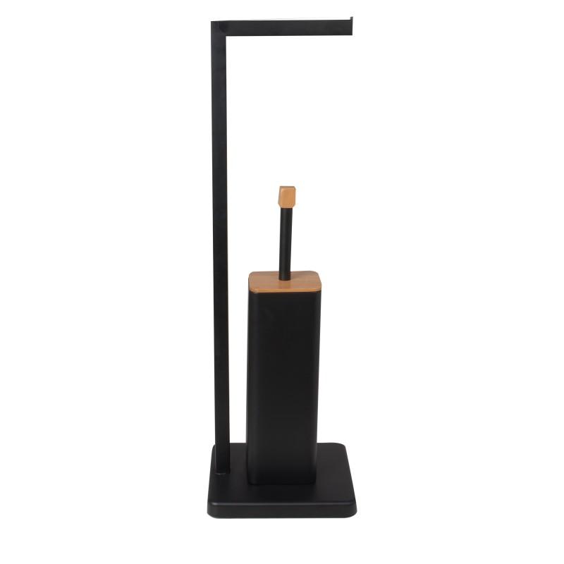 Wolnostojąca szczotka do WC ze zintegrowanym uchwytem na papier toaletowy. Stojak wykonany jest z wysokiej jakości stali malowanej na czarno. Górna część rączki szczotki WC ozdobiona została elementem wykonanym z naturalnego drewna bambusowego odpornego na wilgoć. Stojak posiada solidną podstawę o kwadratowym kształcie, zapewniającą stabilność. Szczotka posiada zabezpieczający plastikowy pojemnik chroniący przed rdzewieniem i ułatwiający czyszczenie. Lekki stelaż umożliwia łatwe przenoszenie stojaka w dogodne miejsce. Antypoślizgowa podstawa zapewnia stojakowi dużą stabilność.