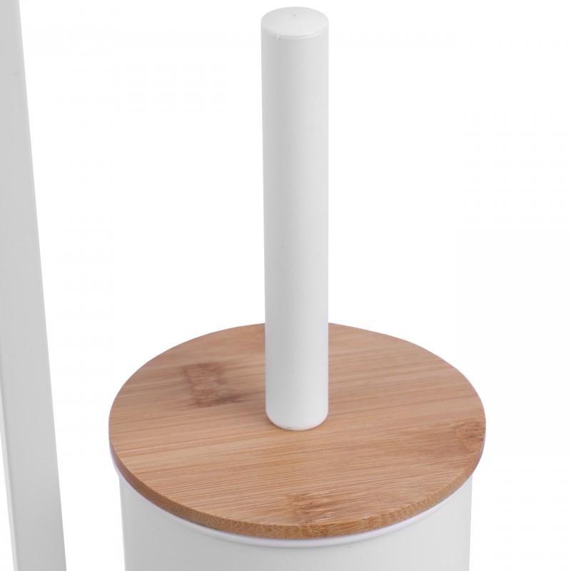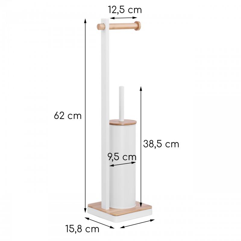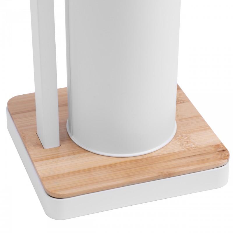 Wolnostojąca szczotka WC ze zintegrowanym uchwytem na papier toaletowy. Stojak wykonany jest z wysokiej jakości stali malowanej na biało. Podstawa i uchwyt na papier z naturalnego drewna bambusowego. Szczotka posiada zabezpieczający plastikowy pojemnik chroniący przed rdzewieniem i ułatwiający czyszczenie. Szeroka podstawa, wykończona stalowym białym obramowaniem zapewnia doskonałą stabilność. Doskonałe wyposażenie każdej toalety. Idealnie sprawdzi się we wnętrzu urządzonym w stylu klasycznym, nowoczesnym lub skandynawskim.