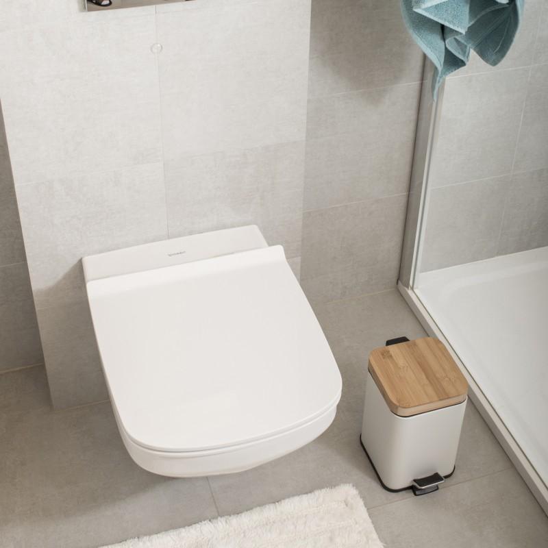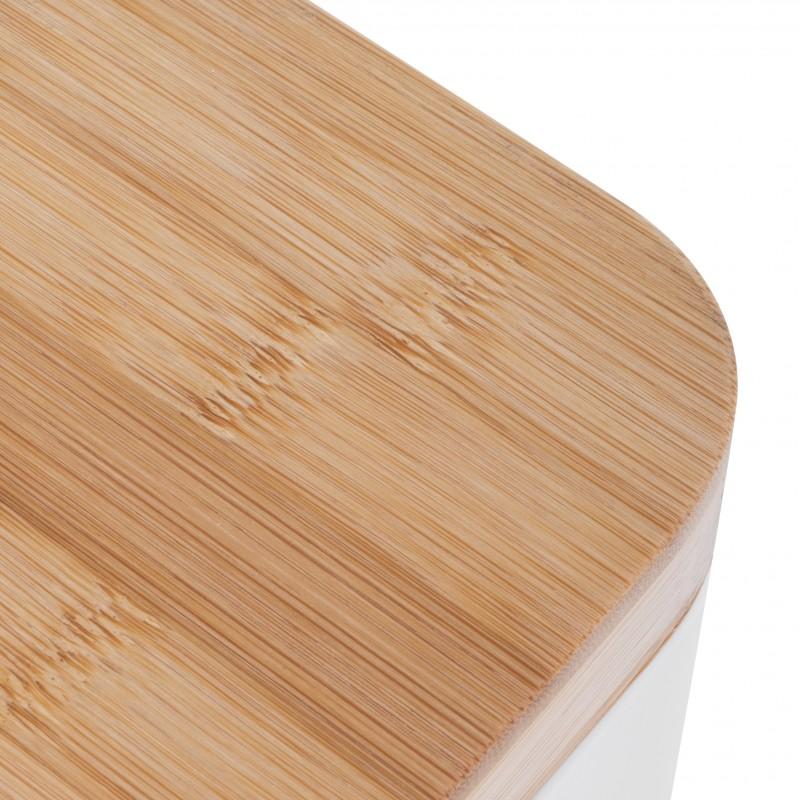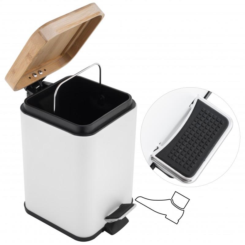 Nowoczesny kosz łazienkowy wykonany ze stali malowanej proszkowo oraz naturalnego drewna bambusowego. Pojemnik w kolorze białym o idealnie gładkim, matowym wykończeniu. Pokrywka zrobiona z drewna bambusowego dodaje wyjątkowego wyglądu całemu produktowi. Nowoczesna, kwadratowa forma kosza. Dzięki wygodnemu pedałowi możemy otworzyć pokrywę bez używania rąk. Wewnątrz kosza znajduje się czarny, plastikowy pojemnik, który posiada praktyczną rączkę, dzięki której łatwiej jest opróżnić kosz. Podstawa całego produktu wykonana jest z tworzywa sztucznego, które nie porysuje powierzchni podłogi w łazience czy toalecie. Z tyłu kosza znajduje się ruchomy, metalowy uchwyt do przenoszenia lub zawieszenia kosza.