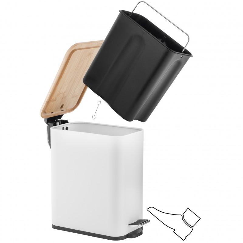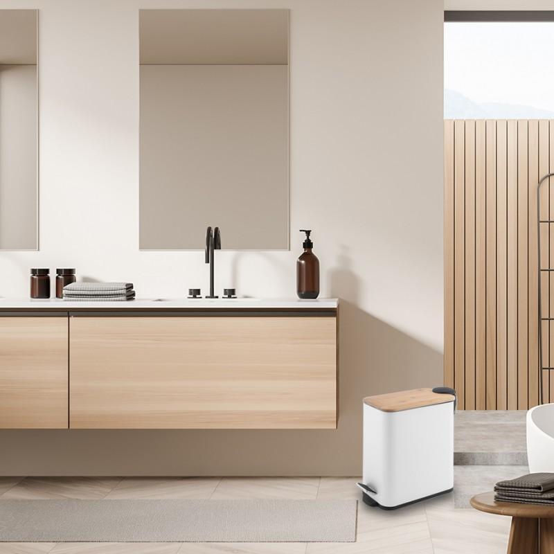 Nowoczesny kosz łazienkowy wykonany ze stali malowanej proszkowo oraz z naturalnego drewna bambusowego. Pojemnik w kolorze białym o idealnie gładkim, matowym wykończeniu. Pokrywa zrobiona z drewna bambusowego dodaje wyjątkowego wyglądu całemu produktowi. Dzięki wygodnemu pedałowi możemy otworzyć pokrywę bez używania rąk. Wewnątrz kosza znajduje się czarny pojemnik, który posiada praktyczną rączkę, dzięki której łatwiej jest opróżnić kosz. Podstawa całego produktu wykonana jest z tworzywa sztucznego, które nie porysuje powierzchni podłogi w łazience czy toalecie. Z tyłu kosza znajduje się dodatkowy, metalowy uchwyt do przenoszenia lub zawieszenia kosza. Pojemność kosza wynosi 5 litry.