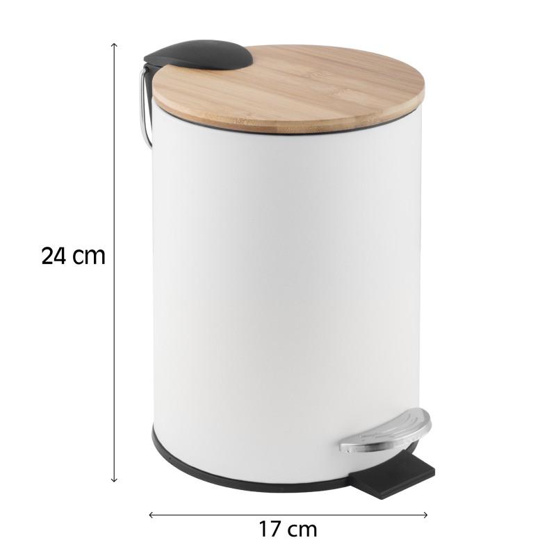 Nowoczesny kosz łazienkowy wykonany ze stali malowanej proszkowo na biało. Pokrywa zrobiona z drewna bambusowego. Pojemnik o idealnie gładkim, matowym wykończeniu. Podstawa całego produktu wykonana jest z tworzywa sztucznego, która zapobiega rysowaniu powierzchni podłogi. Z tyłu kosza znajduje się ruchomy, metalowy uchwyt do przenoszenia lub zawieszenia kosza. Kosz na śmieci idealnie nadaje się zarówno do łazienki jak i do kuchni, do segregacji np. bio odpadów.