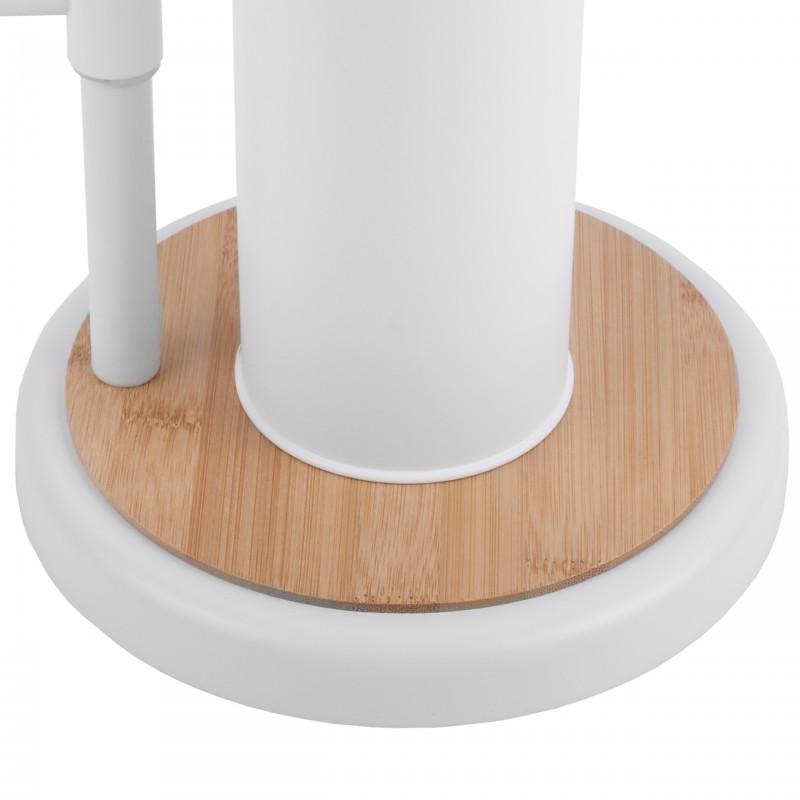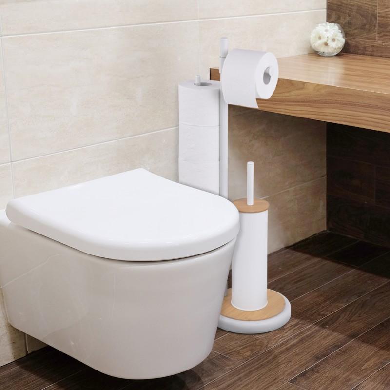 Elegancki stojak na zapasowy papier toaletowy wraz ze szczotką WC oraz z uchwytem na dodatkową rolkę. Stojak wykonany z wysokiej jakości stali malowanej proszkowo oraz elementami bambusa. Szeroka podstawa oraz podkładki z tworzywa sztucznego zapewniają doskonałą stabilność. Doskonałe wyposażenie każdej toalety. Idealnie sprawdzi się we wnętrzu urządzonym w stylu klasycznym, nowoczesnym lub skandynawskim.
