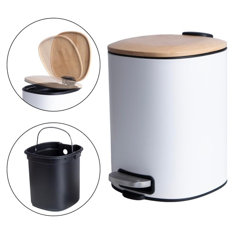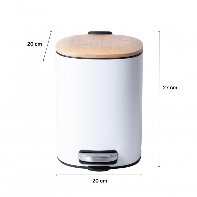 Nowoczesny kosz łazienkowy wykonany z metalu w białym kolorze. Pokrywa wolnoopadająca, zrobiona z drewna bambusowego. Pojemnik o idealnie gładkim, matowym wykończeniu. Podstawa całego produktu wykonana jest z tworzywa sztucznego, która zapobiega rysowaniu powierzchni podłogi. Z tyłu kosza znajduje się ruchomy, metalowy uchwyt do przenoszenia lub zawieszenia kosza.