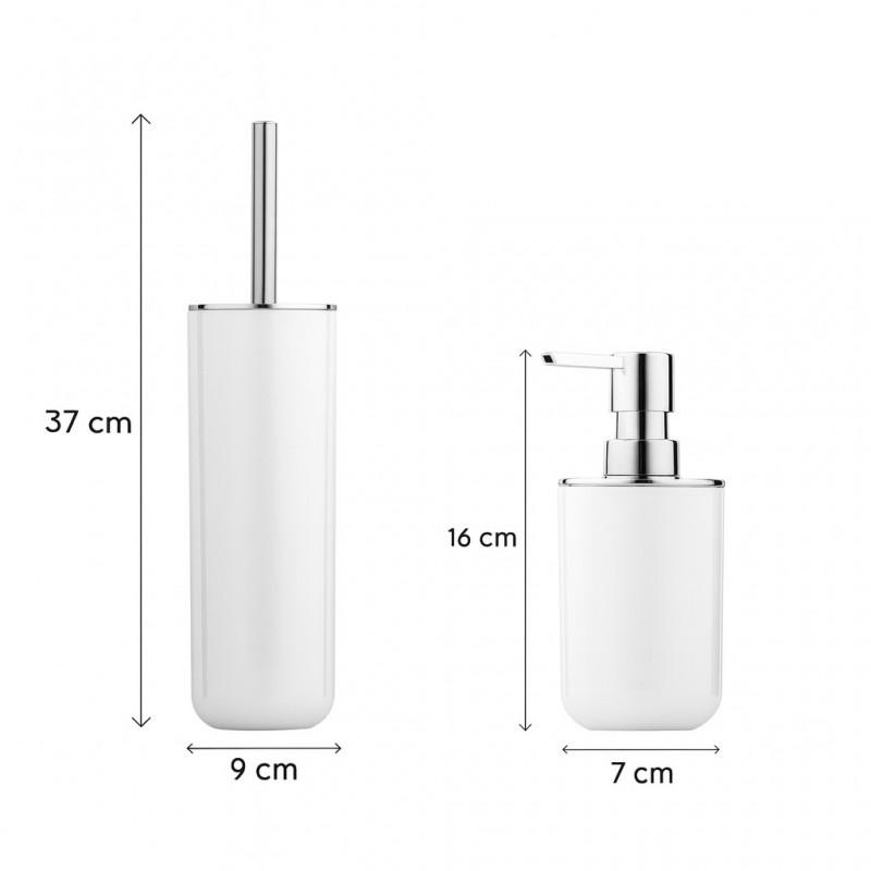 Komplet składa się ze szczotki WC do toalety oraz dozownika na mydło w płynie z metalową pompką, tworząc spójną całość w kolorze błyszczącej bieli z chromowanymi detalami.