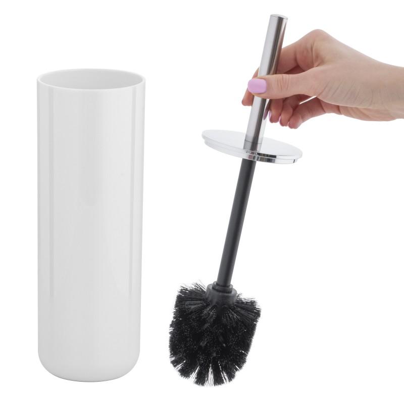 ✦ Szczotka do WC – biała z metalową rączką zakończoną chromowaną pokrywką.