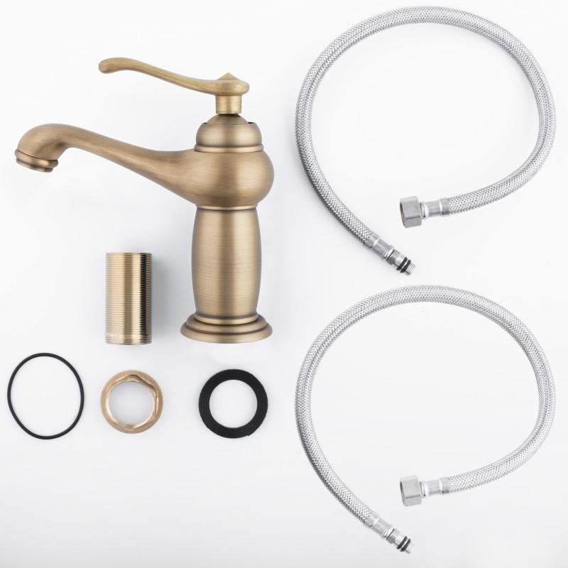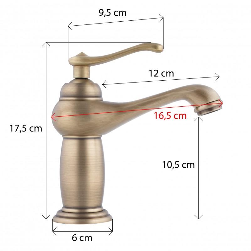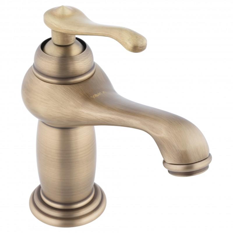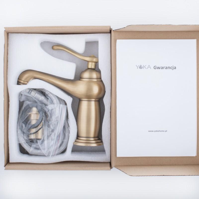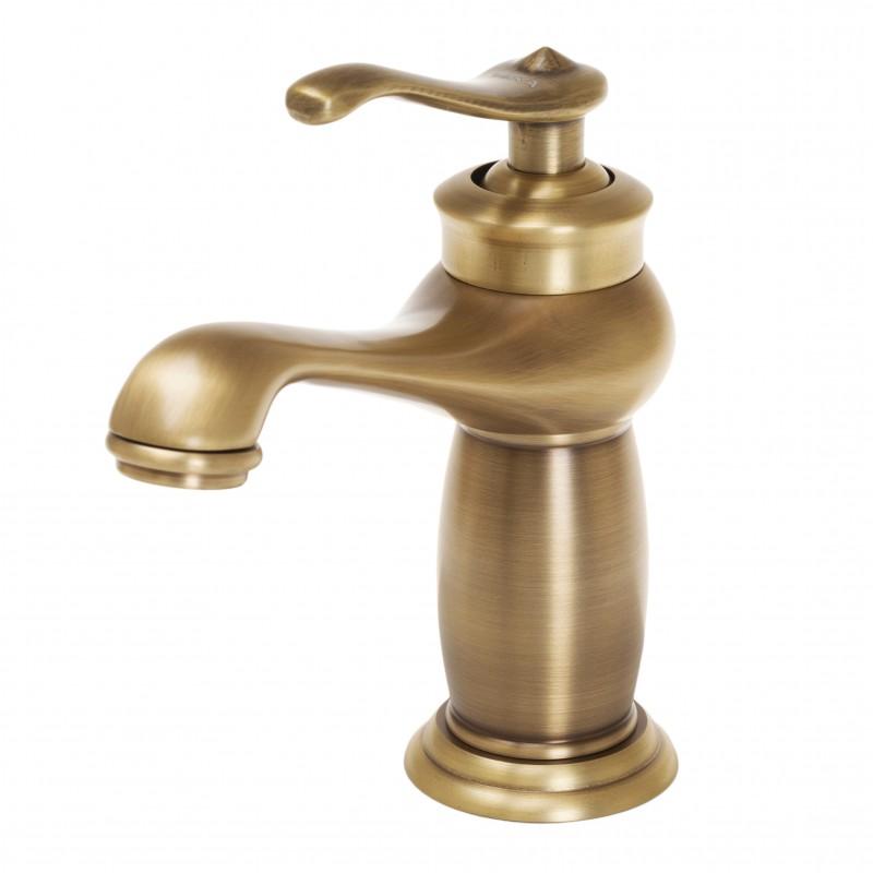 Mechaniczna bateria umywalkowa, stojąca, jednouchwytowa ze stałą wylewką. Bateria wykonana w stylu retro/vintage w kolorze złotym. Głowica ceramiczna 35 mm. Korpus baterii wykonano z mosiądzu.