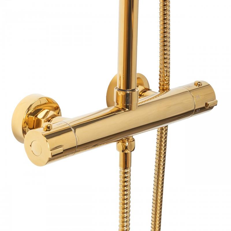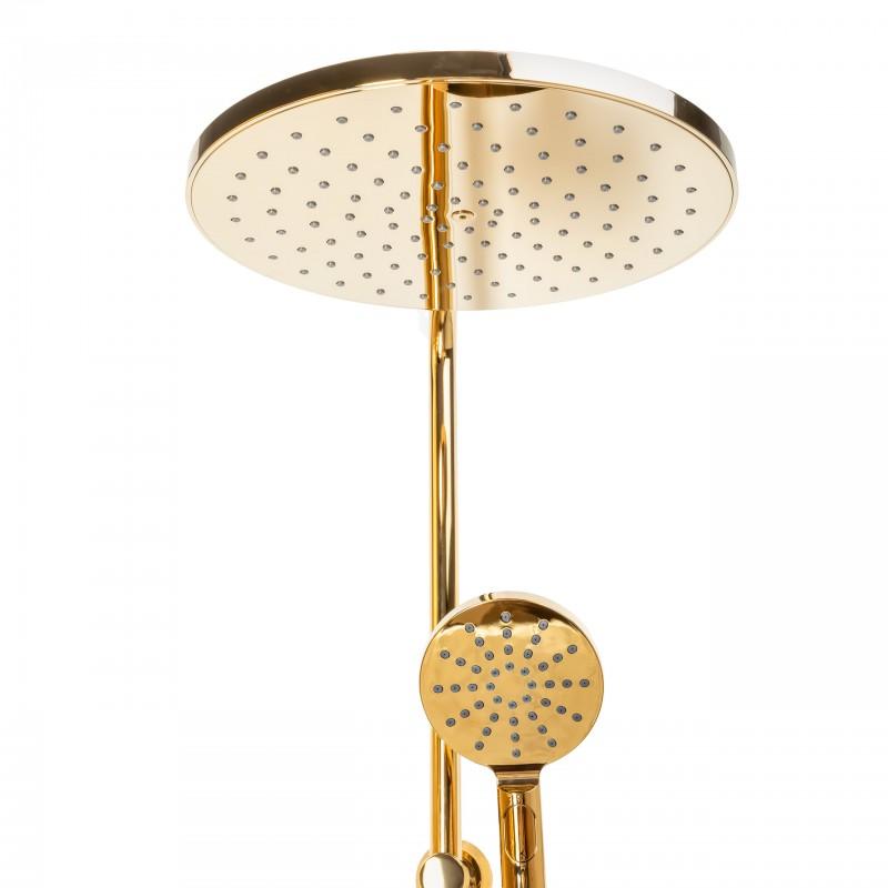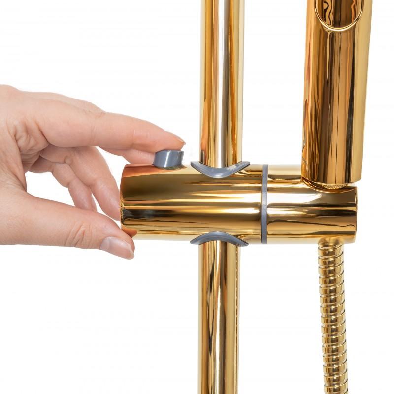 Złote wykończenie klasy premium oraz nowoczesna technologia to kluczowe cechy tego eleganckiego zestawu prysznicowego, który idealnie wpisuje się w trendy luksusowych łazienek.