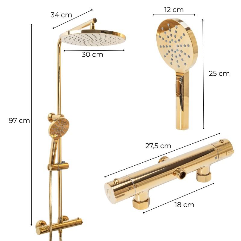 Zestaw zawiera wysokiej jakości termostatyczną baterię, dużą deszczownicę o średnicy 30 cm, a także słuchawkę prysznicową z trzema trybami strumienia wody.