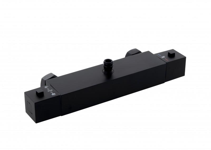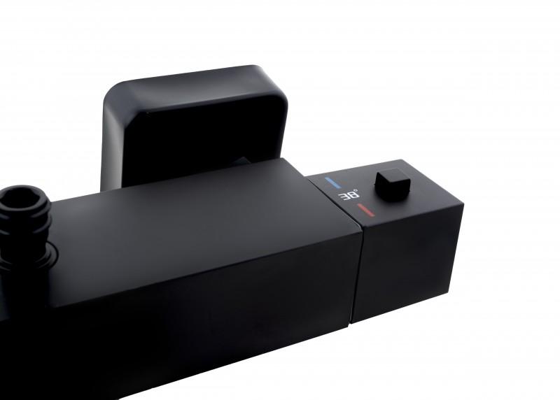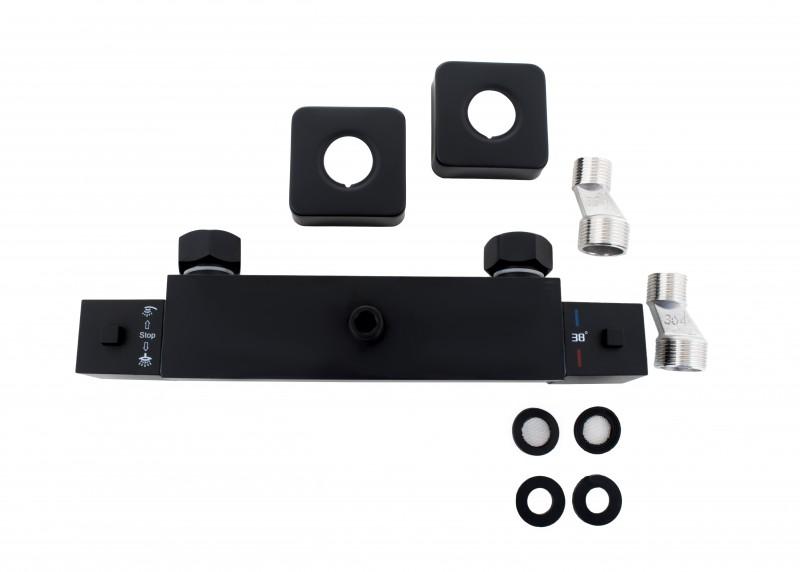 Termostatyczna naścienna bateria prysznicowa w kolorze czarnym. Wykonana jest z wysokiej jakości mosiądzu. Bateria z funkcją precyzyjnego ustawiania temperatury gwarantuje wysoki komfort oraz bezpieczeństwo użytkowania natrysku. Posiada blokadę gorącej wody przy 38°C. W zestawie znajdują się wszystkie elementy potrzebne do montażu