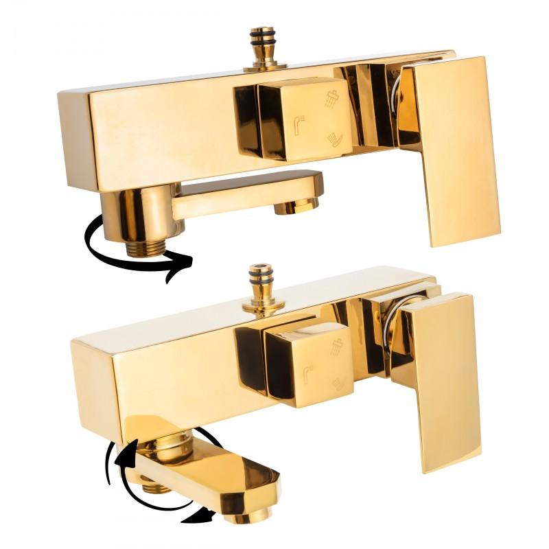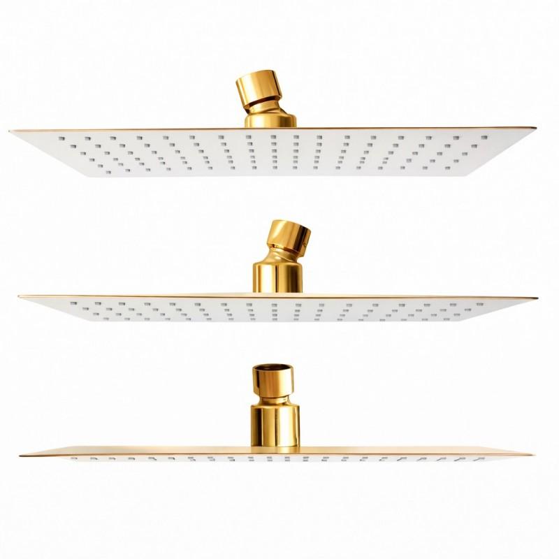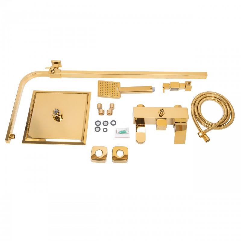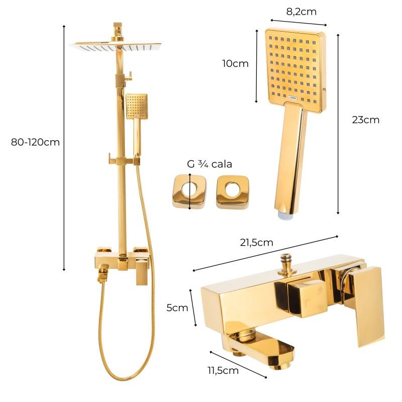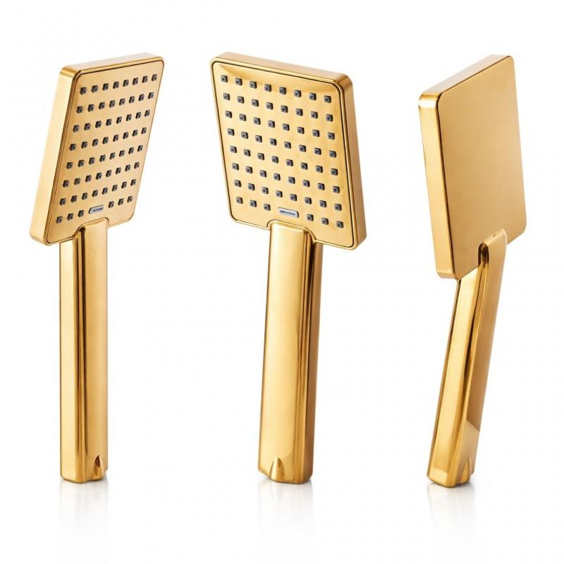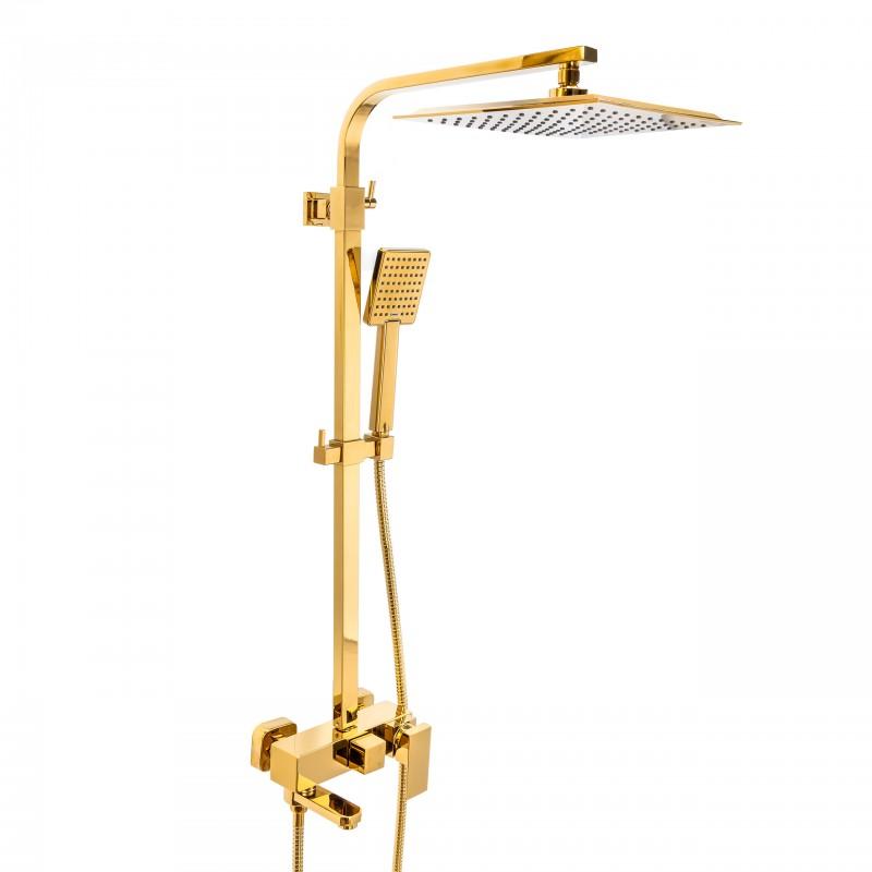 regulacją i przełącznikiem strumienia wody między deszczownicą, a słuchawką. Ceramiczna głowica baterii (35 mm) gwarantuje trwałość i wytrzymałość. Zestaw zawiera szeroką, stylową deszczownicę o wymiarach 25 x 25 cm oraz słuchawkę prysznicową w kolorze złotym - obydwa elementy z nowoczesnym systemem ANTI-CALC. Design zestawu został podporządkowany najnowszym trendom - prezentuje się niezwykle elegancko i idealnie pasuje do nowocześnie urządzonej łazienki.