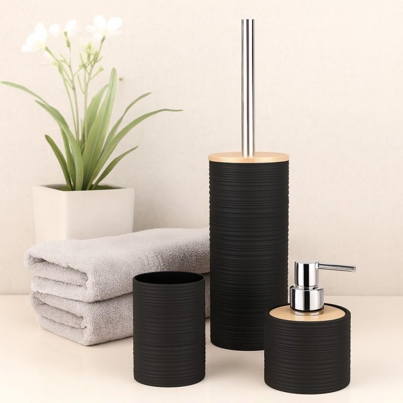 Komplet akcesoriów łazienkowych z naturalnego bambusa, czarny - Szczotka do WC Dozownik i Kubek - Yoka Home